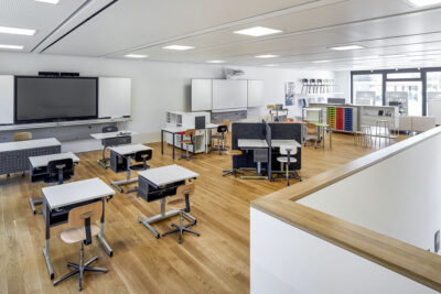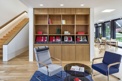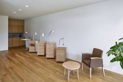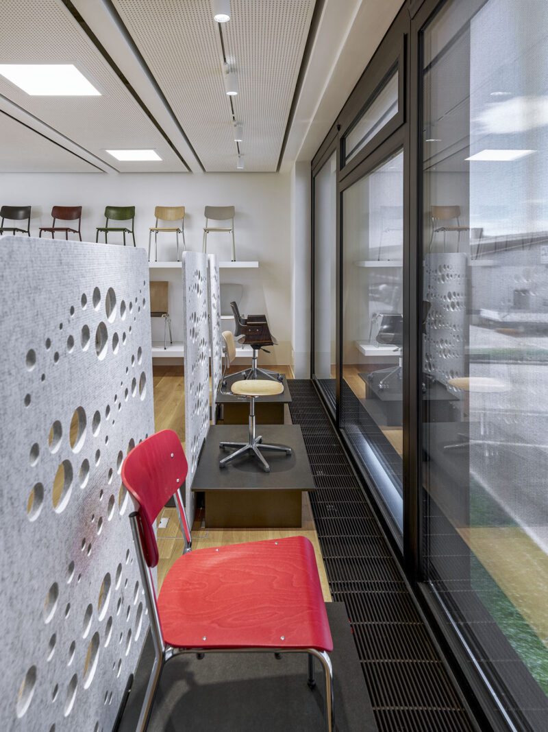 Im eigens für die Ausstellung der Produkt-Palette von Embru erstellten Gebäude sind sämtliche Möbel aus den Sortimenten Schule, Pflege, Wohnen, Büro, Klassiker + Gartenmöbel auf einer Fläche von 344 m² ausgestellt.