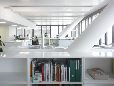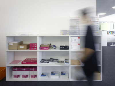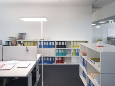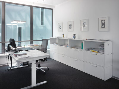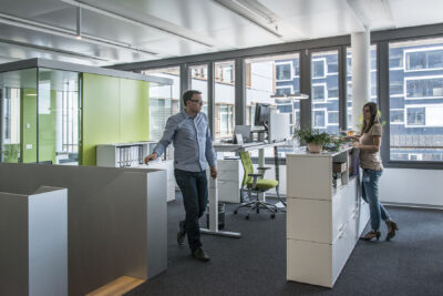 Die Arbeitsplätze wurden mit eQ Stauraummodulen und elektrisch höhenverstellbaren Steh-/Sitztischen von uns eingerichtet. Anstatt Stellwände geben höhere Modulinseln die räumliche Struktur im Open-Space-Bürobereich. Neben ausreichendem Stauraum bieten diese Module ideale Ablageflächen, an denen die Mitarbeitenden auch kurz etwas besprechen oder sich austauschen können. Gearbeitet wird grösstenteils an den neuen, höhenverstellbaren Tischen. Sie erlauben flexibel zu bleiben, dynamisch und gesund zu arbeiten und sorgen für einen abwechslungsreichen Arbeitsalltag.